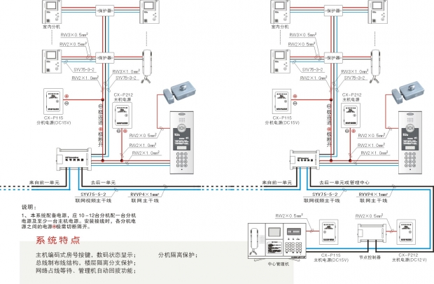 CX-100智能楼宇可视对讲及联网报警控制系统由安防管理中心、单元门主机、住户室内分机三个主要部分构成。网络是由单元内垂直部分总线连接并通过 CAN总线网络传输至管理中心管理主机。系统以CX-M100中心管理机为整个系统的管理和控制中心,通过节点控制器将各单元系统连接起来。系统中的器材 功能全面,适合各种不同的楼宇结构和用户的不同要求。
